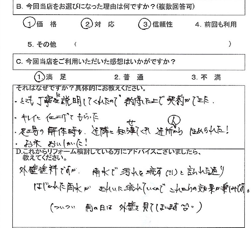 あなたは念願のマイホーム購入から、早や10年、20年経過した時、「この家にもっと長く住みたいなぁ」と思いませんか?いづれ、これからリフォームする時期が訪れるでしょう。その時です、どこにお金かけますか?ここの判断で家の寿命が延びるか、寿命が縮まるかの分かれ道です。30年経過しても綺麗を維持している家の施主様は予防としてリフォーム計画しております。それに対して、悪くなってから修繕工事する方は修繕費にお金かかりすぎて、現状維持する事に留まり、リフォームしても、中々グレードアップした快適生活とは無縁でいます。年々、商品も良くなっているので、どうせリフォームするのであれば、やって良かったと思える様、修繕に追われるお金の使い方より、マイホーム購入時よりグレードアップした商品でリフォームし、より快適を実感できる様、生きたお金を使ってみませんか?長期維持の秘訣の一つとして、外壁塗装は切っても切れないリフォームです。秘訣は紫外線対策が考えられます。遮熱塗料、窓インプラス、カバー工事等 リフォームする際、内外装さまざまな商品ございますが、コスト的には塗装が一番手が出しやすいので、家のダメージが少ない時に予防リフォームの一つ外壁塗装を検討してみましょう。